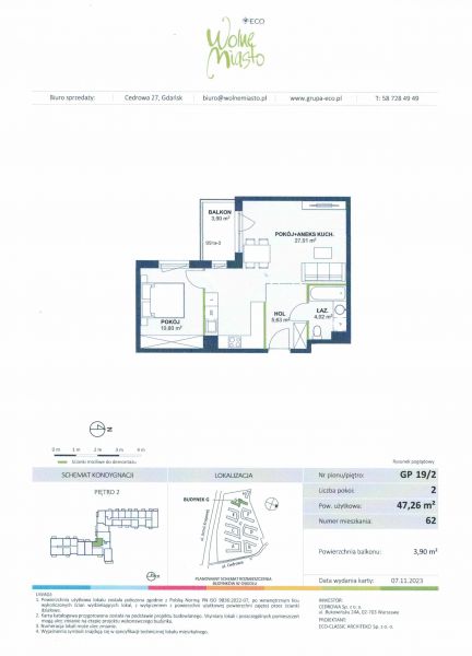 Słoneczne nowe dwupokojowe mieszkanie o powierzchni 48 m kw usytuowane na II piętrze w zacisznej lokalizacji na nowym zamkniętym osiedlu Wolne Miasto przy ulicy Cedrowej 35. Mieszkanie składa się z pokoju z aneksem kuchennym, sypialni, łazienki, przedpokoju, balkonu, miejsca parkingowego w hali garażowej oraz komórki lokatorskiej. Jest solidnie wykończone (w trakcie) dobrej jakości materiałami oraz cechuje się funkcjonalnością. Pokój z aneksem kuchennym z oknem (27,01m kw.) w pełnej zabudowie z wysokimi szafkami i nowym sprzętem AGD: lodówka, zmywarka (60), płyta indukcyjna, piekarnik. Łazienka z prysznicem walk-in oraz podwieszanym WC, pralka. Balkon (3,09m kw), sypialnia (10,60m kw.) usytuowane są od południowo-zachodniej strony. We wszystkich oknach znajdują się rolety wewnętrzne. W przedpokoju znajduje się szafa typu „komandor” (250x120x60 oraz 250x110x60) w sypialni. Do mieszkania przynależy niezależne miejsce parkingowe w hali garażowej blisko windy. Oprócz zabudowy kuchennej i jej wyposażenia mieszkanie nie jest umeblowane, ściany w kolorze białym. Jest możliwość podłączenia telefonu, internetu i telewizji kablowej "światłowód". Na osiedlu znajduje zaplecze handlowo - usługowe oraz przedszkole. Osiedle jest całodobowo monitorowane przez ochronę oraz system kamer. Do Starówki 15 min, a do trójmiejskiej obwodnicy 10 min autem, przystanek autobusowy przy ulicy Cedrowej (linia 195). Czynsz 3000zł/mc. Opłaty eksploatacyjne ok. 700 zł, ponadto opłata za zużycie energii elektrycznej według wskazań licznika rozliczana miesięcznie. Kaucja zwrotna 4000 zł., Mieszkanie obecnie jest w trakcie wykańczania możliwość obejrzenia i najem od 27.10.25r. Zwierzęta są akceptowane. Wyłącznie najem długoterminowy (minimum rok z możliwością przedłużenia). Pośrednikom dziękuję!