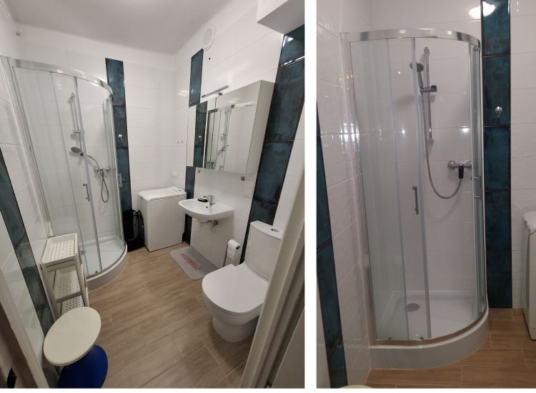 Łazienka: kabina prysznicowa, pralka, umywalka, toaleta
