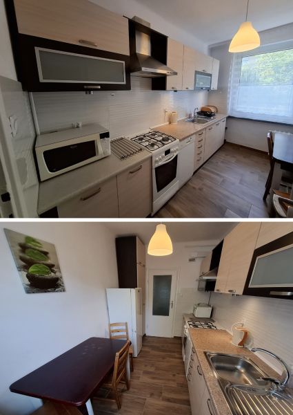 Kuchnia: pełna zabudowa kuchenna, kuchenka mikrofalowa, kuchenka gazowo-elektryczna, zmywarka, lodówka, stół i krzesła