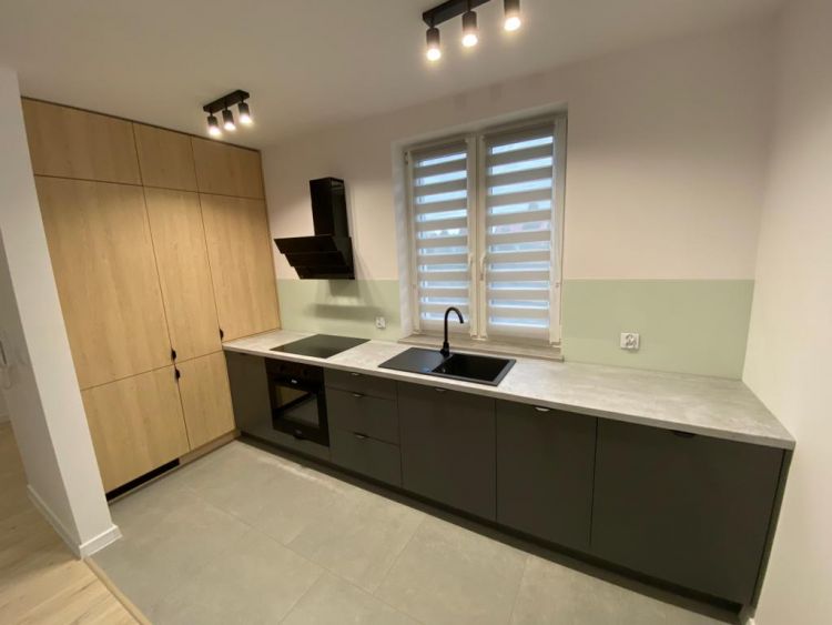 - jasnej kuchni (zmywarka, lodówko - zamrażarka, piekarnik, płyta elektryczna, okap) połączonej z salonem i wyjściem na balon ( stół jadalniany, 2 krzesła , sofa, stolik kawowy, szafa w zabudowie )