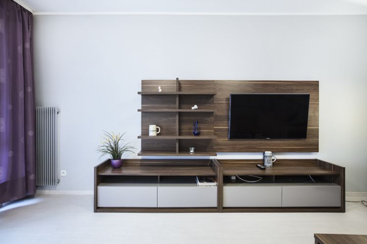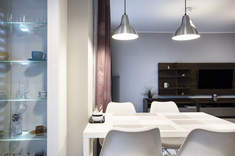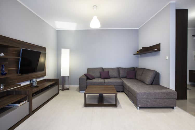 W salonie znajduje się narożnik z funkcją spania, stolik okolicznościowy, meblościanka, duży telewizor LCD, a także wyjście na balkon. Półotwarta widna kuchnia z kompletnym wyposażeniem w zabudowie - lodówka z zamrażarką, zmywarka, pralka, mikrofalówka, czajnik elektryczny i kuchenka.
