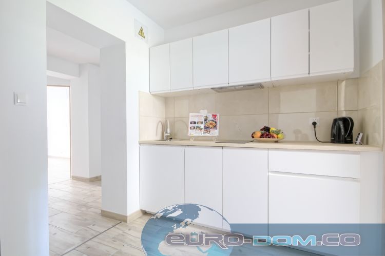 Kuchnia jest w pełni wyposażona w niezbędne urządzenia do przygotowywania posiłków, takie jak lodówka z zamrażarką oraz kuchenka elektryczna.