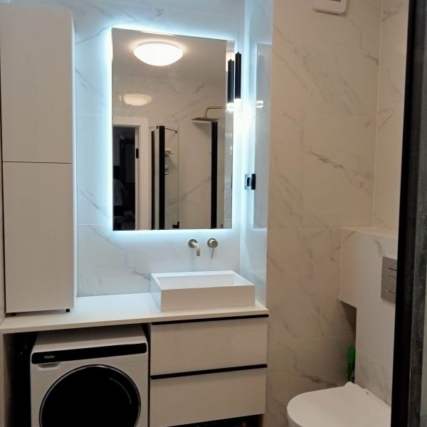 • łazienka z prysznicem typu walk-in oraz pralką