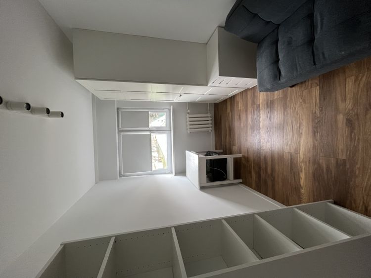 → Pokój dzienny połączony z kuchnią – jasny, z wyjściem na mały balkon