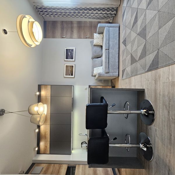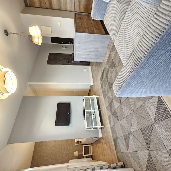 • Przestronna strefa dzienna z aneksem kuchennym i sypialnią