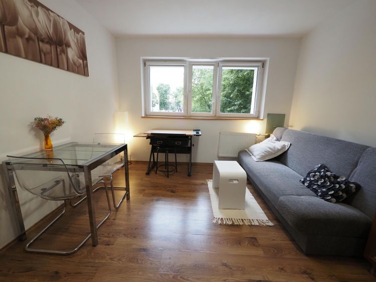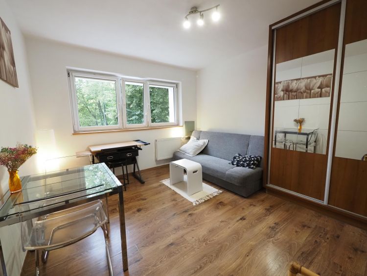 Okna na całą ścianę dają dużo światła, zamontowano w nich rolety. Mieszkanie jest przytulne z widokiem na podwórze i dużo zieleni. Blok usytuowano w drugiej linii od ulicy, więc mimo bliskości pętli tramwajowej jest bardzo cicho. Orientacja lokalu południowo-zachodnia.