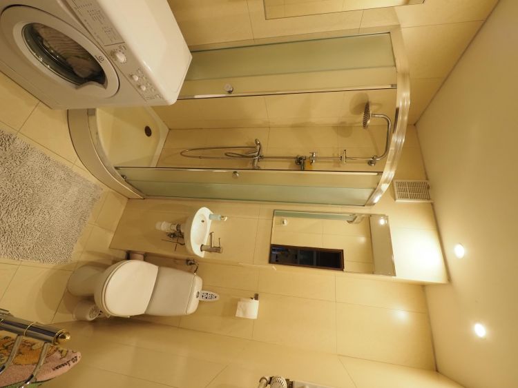 Duża łazienka z prysznicem, pralką, umywalką i wc.