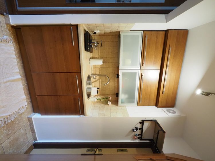 Salonik umeblowany z bardzo dużą szafą z lustrami, wygodnym rozkładanym tapczanem z wysuwanymi 3 stolikami, rozsuwanym szklanym stołem i komfortowymi krzesłami, fotel oraz duże biurko z regulowaną wysokością i kątem nachylenia.