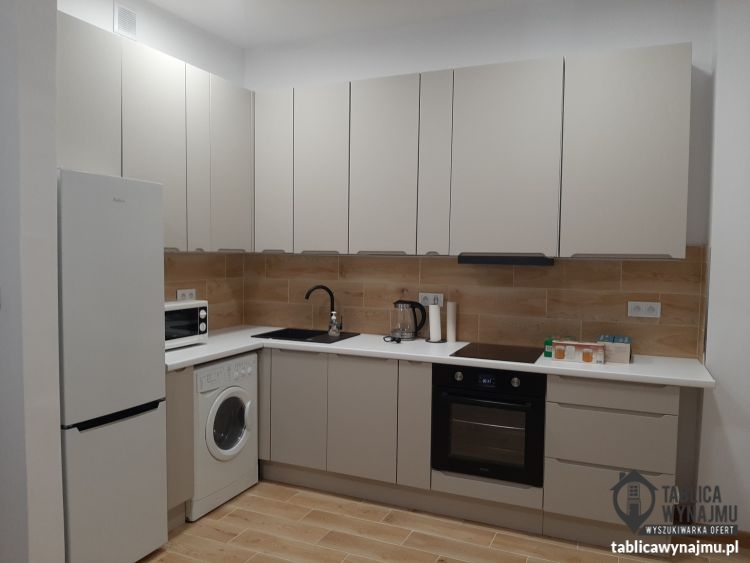W części kuchennej szafki w zabudowie, lodówka, zmywarka, płyta indukcyjna, piekarnik, okap, kuchenka mikrofalowa, czajnik oraz pralka. Mieszkanie posiada duży balkon z widokiem na centrum Warszawy.