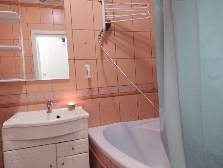 W pokoju szafa, stół, krzesło, oraz wygodna kanapa. W oknie – roleta. Łazienka z umywalką, wanną i wc. W mieszkaniu pralka, lodówka, mikrofalówka, czajnik, suszarka itp.